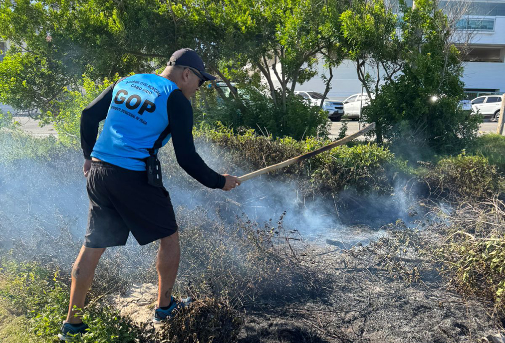 A Guarda Civil Municipal de Cabo Frio, por meio do grupamento operacional de praia, atuou na tarde desta quinta-feira (15) para conter focos de incêndio em área de vegetação às margens da avenida litorânea, na praia do Forte.