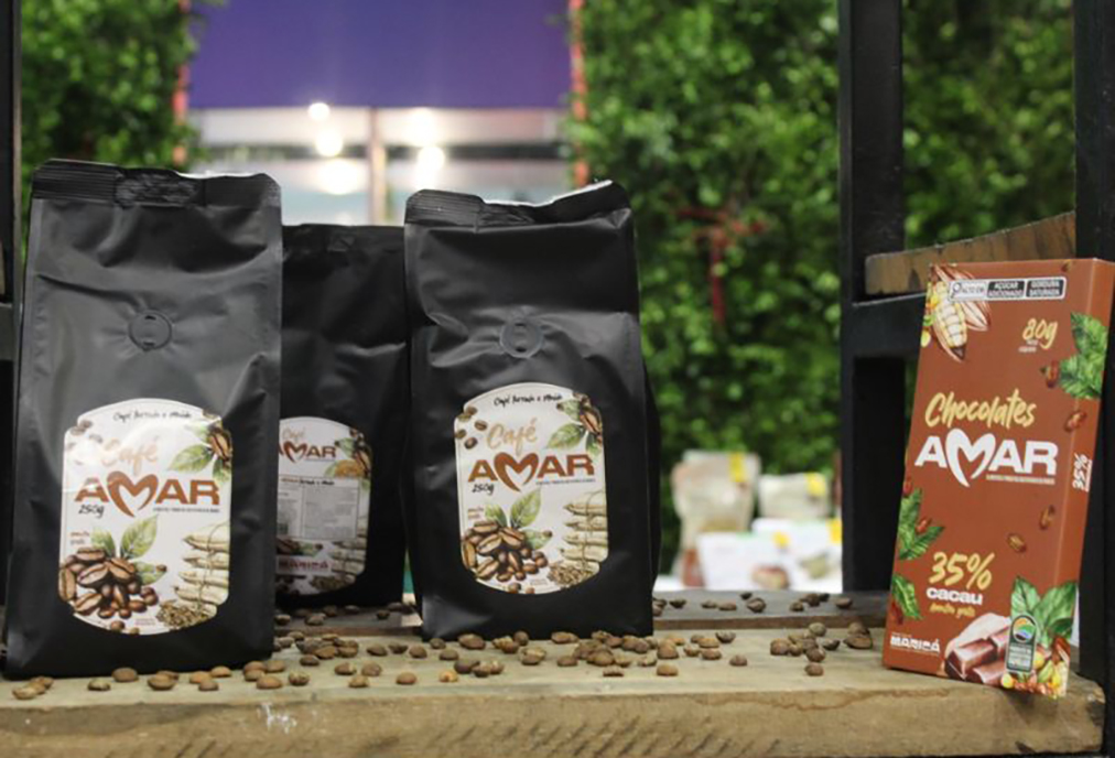 Entre os produtos disponibilizados no estande estão café, mel, frutas desidratadas, como bananas, laranja e limão, e chocolates, produzidos em parceria com a cooperativa baiana de agricultura familiar, Bahia Cacau.